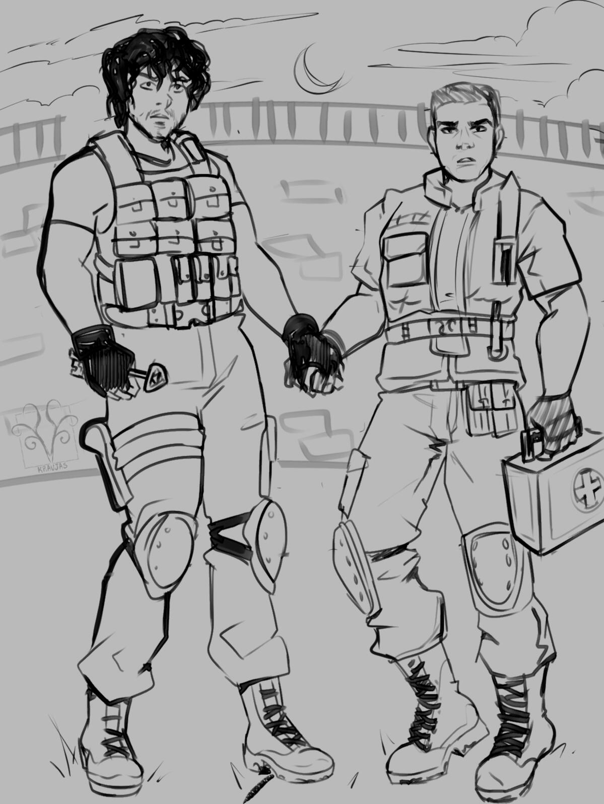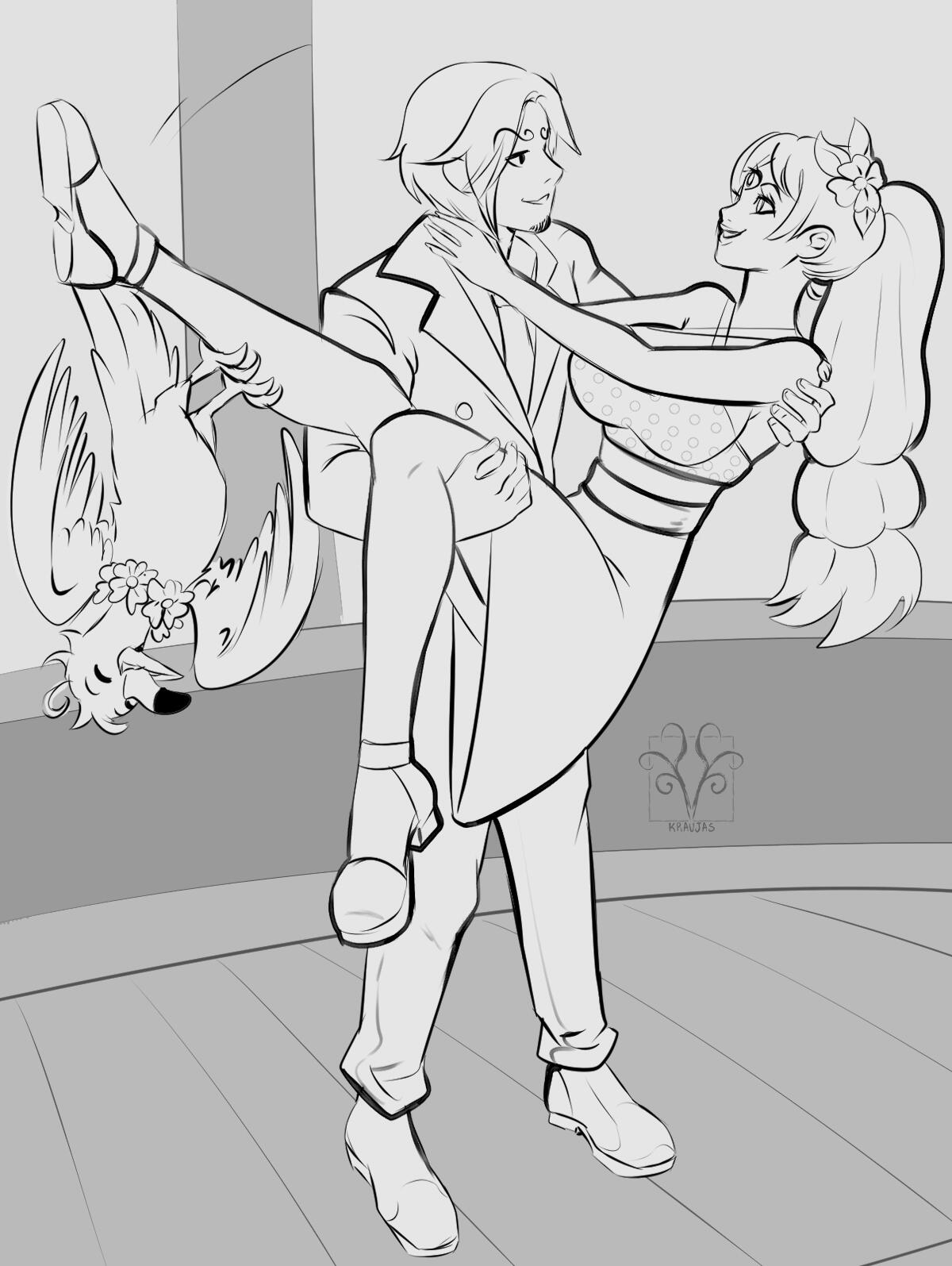 1.- Rough sketch (Rough doodle, "stick figures", main idea and composition. If you don't like the pose we can try another one.)